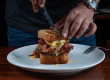 לחם שיפון, רוטב מיונז חזרת, בצל סגול, כרוב כבוש וקרנישונים. מוגש עם צ'יפס.
